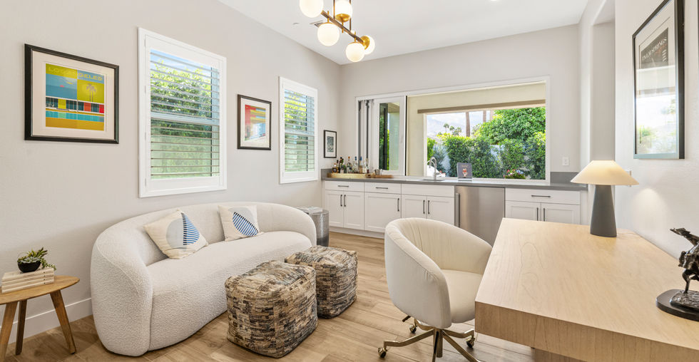 Indulge in elevated desert living at this impeccably furnished 3-bedroom, 3.5-bath residence in prime Indian Wells. Thoughtfully designed with refined style and comfort, the home features curated designer furnishings, luxurious beds, and smart TVs in every bedroom and the living room. A flexible den doubles as a media lounge or home office and includes a sleek bar with a wine fridge and a stunning pass-through window for seamless indoor-outdoor entertaining. The chef's kitchen boasts a large island, ideal for gathering with family and friends.